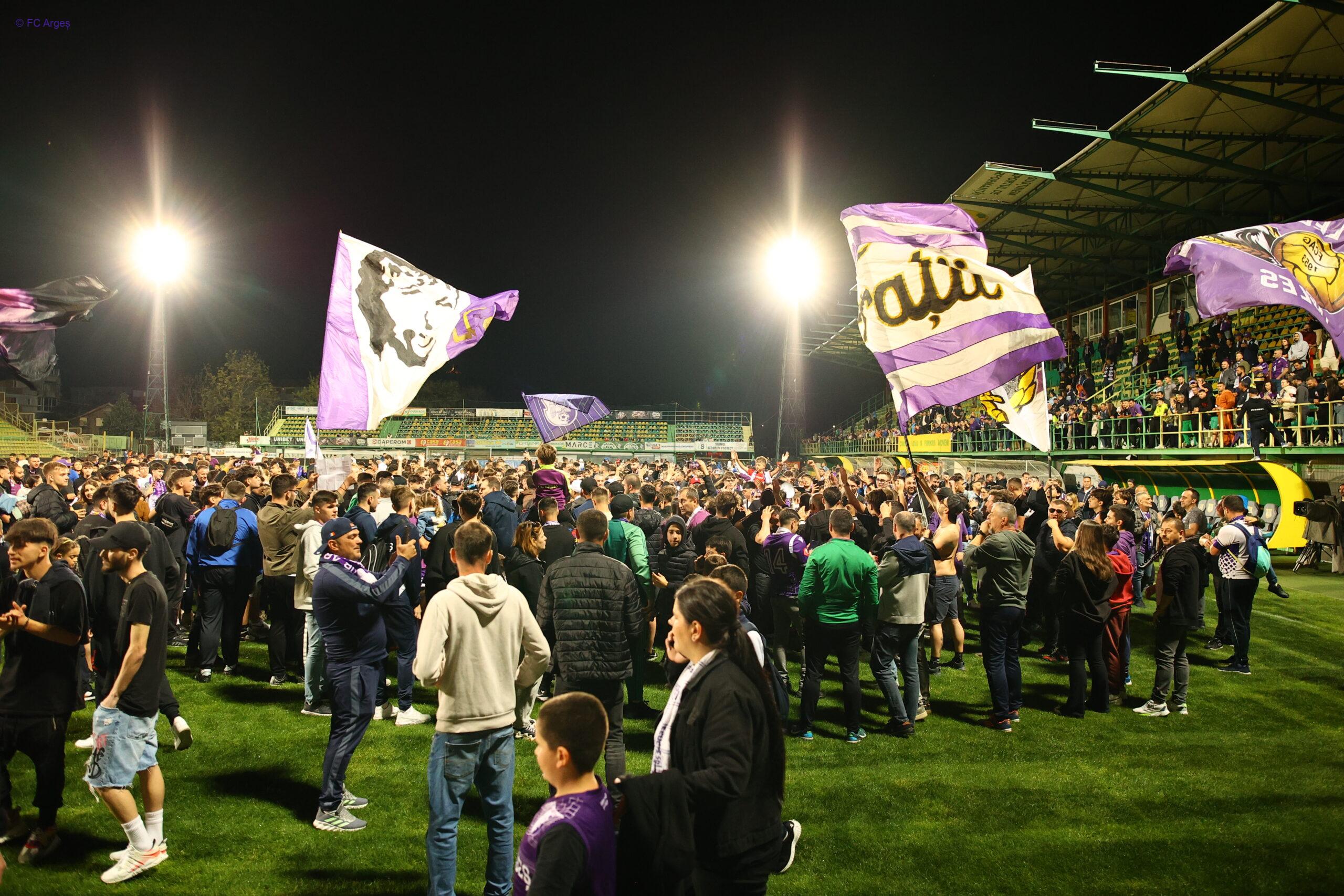 Mii de blițuri s-au aprins pe stadion în ultimele minute, într-o atmosferă pe care FC Argeș n-a mai trăit-o de pe vremurile când juca în prima divizie. „Argeșul echipă mare, e sărbătoare!” și „Adio, Serie B!” au fost refrenurile care au răsunat în finalul meciului pe stadionul din Mioveni. În tribune a fost afișat și un banner cu mesajul: „Când finalul implică fericirea / Începutul nu pare greu de loc… / Ați readus Argeșul unde îi e menirea / Dobrin în cer veghează revenirea”.
