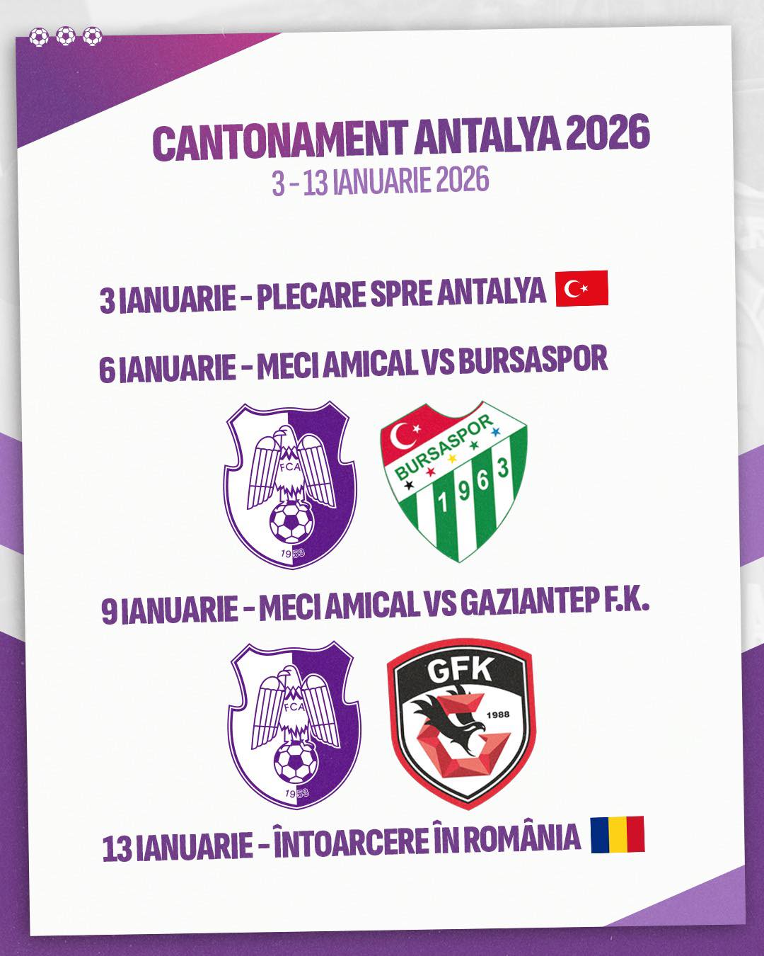 Reunirea lotului este programată pentru data de 3 ianuarie, urmând ca în aceeași zi să se plece în cantonamentul din Antalya, Turcia. Antalya este un oraș situat la poalele munților Taurus, pe litoralul Mării Mediterane. Delegația Argeșului se va întoarce acasă, la Pitești, pe 13 ianuarie.